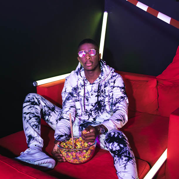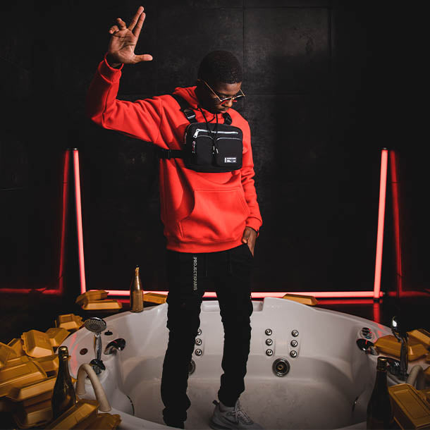Uzi est à fond dans le streetwear et dans la mode, comme énormément d'autres rappeurs actuels. Les vêtements et le côté esthétique font désormais intégralement partie de la panoplie du rappeur, qui marque autant les esprits par sa musique, ses textes, que par son style. C'est dans cet esprit très street, très naturel et actuel, que s'est faite la collaboration entre le rappeur et Project X Paris. Il a donc porté les vêtements de la nouvelle collection Homme de PXP avec style et élégance, et elle lui va à la perfection, notamment toute la gamme de survêtements. Que ce soit l'ensemble unisexe avec les multiples logos PXP, qui rend aussi bien dans les deux couleurs, que l'ensemble tie and dye assez futuriste dans le design. Décontracté mais classe, tout en restant street, le rendu est très efficace, comme les panoplies de Arsenal que le rappeur a utilisées pour le clip de son hit « A la fête », certifié depuis single de platine.