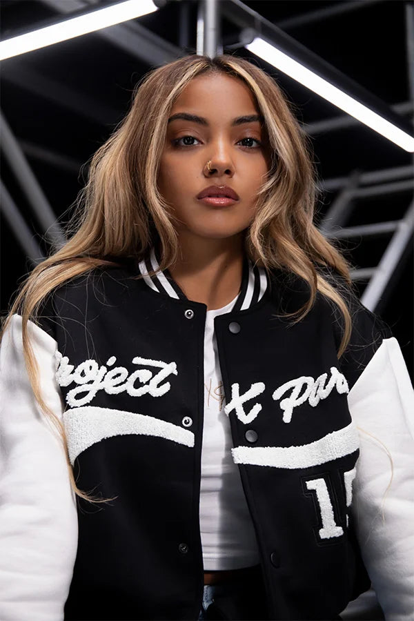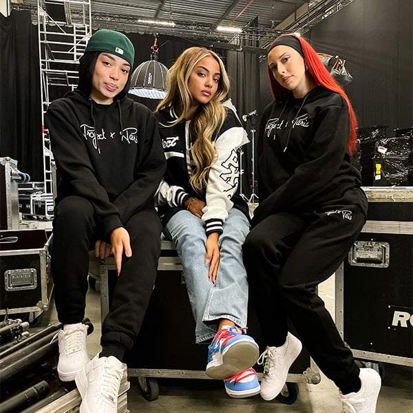 Comme prévu, Wejdene nous a offert un shooting de qualité en portant notamment une de nos pièces les plus emblématiques du moment : la Veste Teddy style Universitaire, en noir. Une des pièces les plus street et les plus 'old school' de notre catalogue, preuve que la chanteuse connaît ses classiques, et même mieux : elle les maîtrise. Le tout porté avec un jean clair et plutôt large, un top blanc assez court, et une paire de Jordan aux lacets colorés. C'est girly, c'est street, c'est un sans faute pour l'artiste. Sur scène, elle porte parfois fièrement un petit crop top blanc Project X Paris, un vêtement streetwear qui fonctionne très bien auprès des femmes. Ses danseuses sont elles aussi dans des tenues PXP noires, avec un bas de jogging qui renforce l'effet street, et on est vraiment reconnaissants d'être portés sur scène par des artistes de manière aussi naturelle.