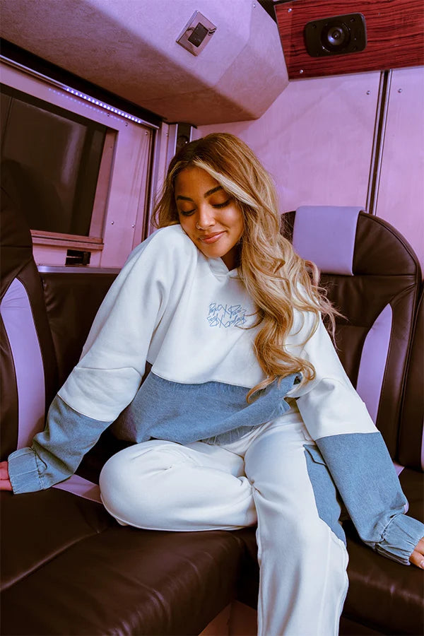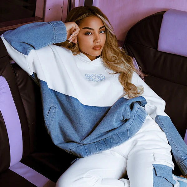 Mais on a aussi un gros coup de cœur pour les photos prises en mode « cocooning » / « tour bus », avec des pièces qu'on a moins l'habitude de voir mises en avant. Notamment le sweat à capuche bicolore et bi-matière, en bleu et blanc, avec une texture hoodie classique pour le haut et une texture de type jean pour le bas. Une pièce assez avant-gardiste dans l'idée, mais là encore, Wejdene ne déçoit pas. Elle a même enfilé l'ensemble entier, avec un bas de jogging bicolore et bi-matière, un peu large, de quoi être confortablement installé dans son tour bus, mais toujours avec style. Le tout, avec une paire de Jordan, mais avec des lacets blancs cette fois, pour mieux se marier avec le bas. Encore un sans faute pour la chanteuse. On est donc vraiment très heureux de pouvoir collaborer avec Wejdene, qui est l'emblème de toute une jeunesse de France, et qui représente aussi certainement un des visages du futur de la musique. On lui souhaite plein de bonheur pour sa tournée, en espérant la revoir bientôt avec de la nouveauté !
