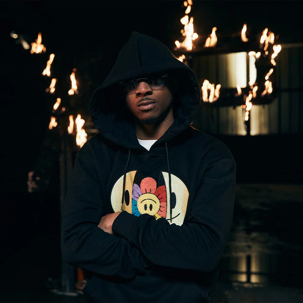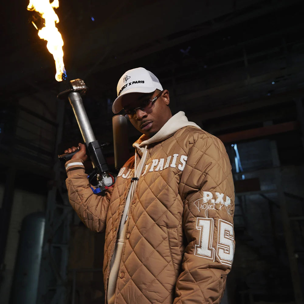 Comme tout se passait très bien, on en a profité pour lui faire essayer des pièces un peu moins ordinaires. Avec notamment cette troisième partie du shooting, où on le retrouve, toujours dans l'entrepôt, lance-flammes à la main et vêtu d'un superbe blouson. Ou plutôt, une veste teddy matelassée, avec les coutures qui font effet losange et les boutons pression pour fermer le tout si besoin. Là encore, on a une couleur marron, un peu plus claire, avec les logos « old school » sur le torse et les manches, qui rappellent un peu les styles universitaires des étudiants US dans les années 90. La veste teddy est portée par dessus un sweat de couleur crème, sans oublier évidemment la casquette blanche toujours bien présente. Le tout marié avec un pantalon style cargo de couleur claire, et une paire de sneakers un peu plus excentrique que les précédentes. Enfin, pour clôturer le shooting en beauté, on a décidé de faire passer à Timal une de nos toutes dernières tendances : la capsule Smiley, dont les logos reprennent de célèbres émojis, retravaillés façon street. Une réussite totale sur le rappeur, avec un sweat à capuche broderie avec smiley sourire (en noir) porté avec un pantalon cargo large, noir lui aussi. Le tout, avec une veste oversize style universitaire aux écussons brodés, une de nos plus belles pièces. Le vrai clou du spectacle, avec le logo PXP enflammé placé derrière le rappeur lors du shooting. Vous l'aurez compris, cette collab avec Timal était plus que chaude, et on espère pouvoir remettre ça rapidement car son univers nous a beaucoup inspiré.