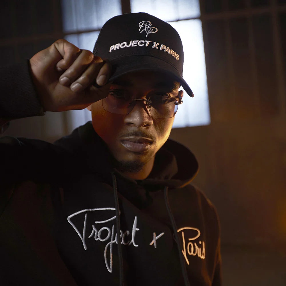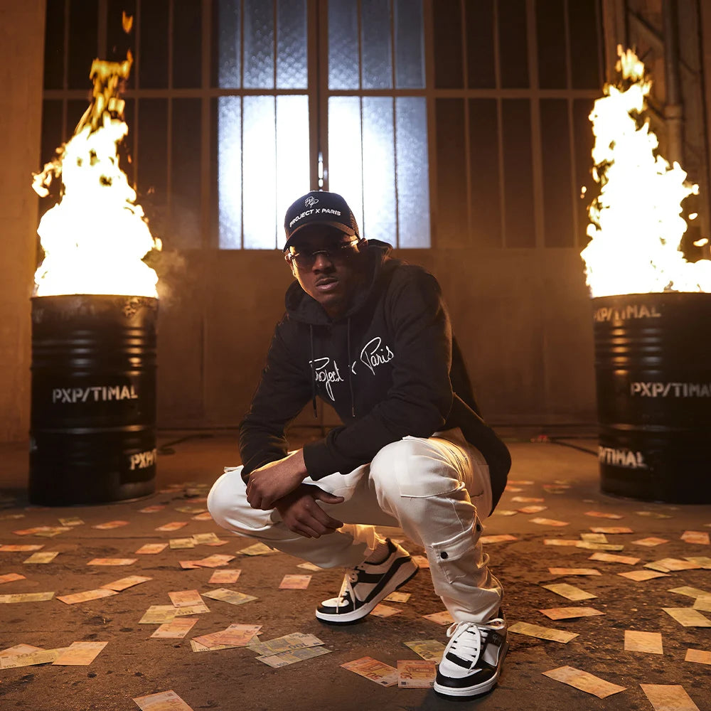 Un artiste avec de l'énergie à revendre donc, et ça tombe bien, car chez Project X Paris, on adore ça. On avait de grands projets pour cette collaboration avec Timal, et on peut dire que le shooting répond complètement à nos attentes avec une DA spécialement inspirée par l'artiste et sa discographie. Dans ses clips, il semble être amateur du streetwear plutôt sobre et efficace, même s'il s'autorise parfois des tenues un peu plus bariolées. On a donc commencé par lui faire tester nos grands classiques issus de la capsule Signature. Et notamment notre hoodie culte PXP, le sweat à capuche Signature de couleur noire, avec le logo stylisé blanc sur le torse. Le tout porté avec une toute nouvelle casquette noire de chez Project X, avec le nom de la marque cette fois en majuscule et un nouveau logo retravaillé pour l'occasion. Petites lunettes fumées, un pantalon blanc style cargo pour le bas, ainsi qu'une paire de sneakers blanc et noir : l'outfit est sobre,mais diablement efficace, surtout dans ce décor de hangar avec des bidons enflammés, un clin d’œil à l'univers du rappeur.